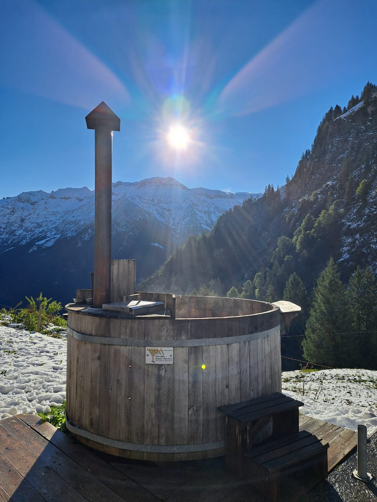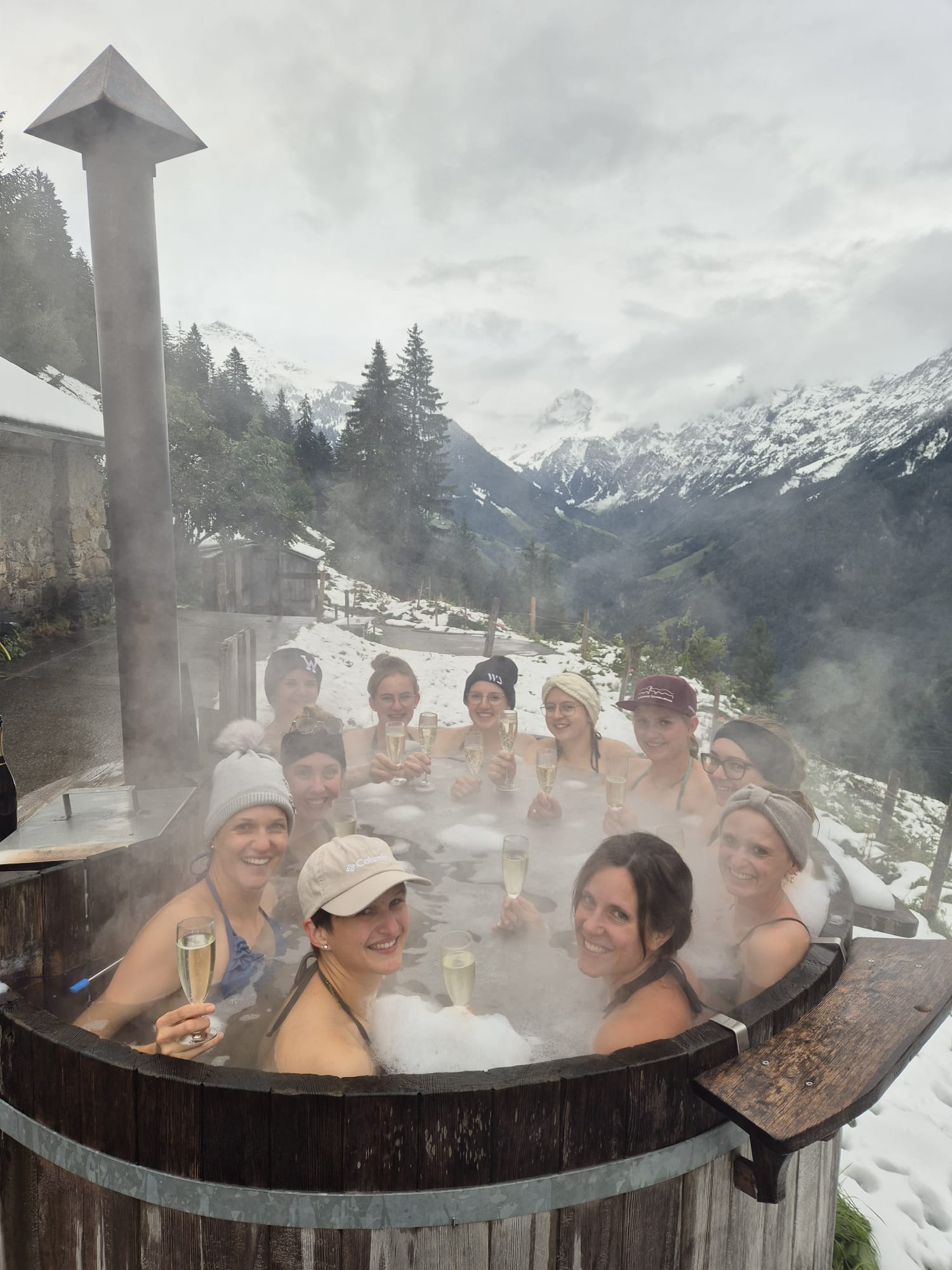 Das Bad im Hotpot war die perfekte Erholung nach der Wanderung. Als sich das Nebelmeer verzog, konnten wir die atemberaubende Aussicht geniessen. Im "Zuber" genehmigten wir uns zudem ein erfrischendes Eisbad. Zum Abendessen gab es köstliche Älplermagronen und