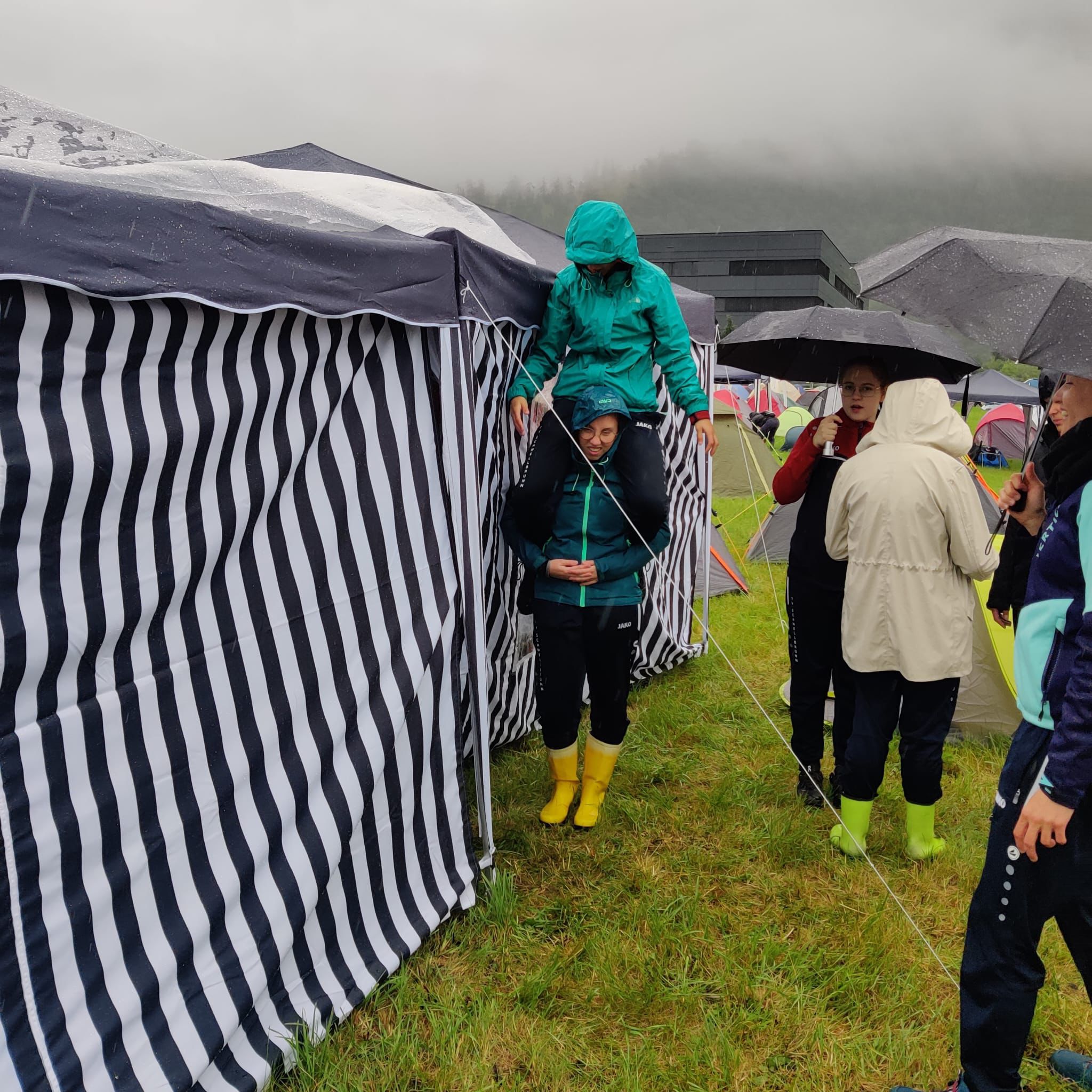 Unser Schlafplatz war in unmittelbarer Nähe zum Wettkampfgelände und so standen wir geschützt vor dem Regen unter dem Pavillon um endlich unsere Noten von den Leiterinnen zu erfahren. Mit der Gesamtnote von 26.88 klassierten wir uns auf dem 13. Rang in der 3. Stärkeklasse. Die grossartigen Noten von 9.44 im Fachtest, 8.7 im Schulstufenbarren und 8.74 in der Gymnastik sind ein Grund zu feiern. Am Sonntagmorgen wurden wir nach einem ausgiebigen oder teilweise kurzem Powernap mit Sonnenschein begrüsst.