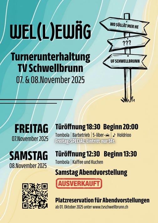 Unter dem Motto Wel(l)ewäg zeigen unsere Turner und Turnerinnen aller Altersklassen ihr Können in abwechslungsreichen, kreativen und humorvollen Darbietungen. Freuen Sie sich auf eine turnerische Vielfalt, überraschende Inszenierungen und mitreissende Momente. Ausserdem ist mit einer reichhaltigen Festwirtschaft, Bar und Kaffeestube für Ihr leibliches Wohl gesorgt.
