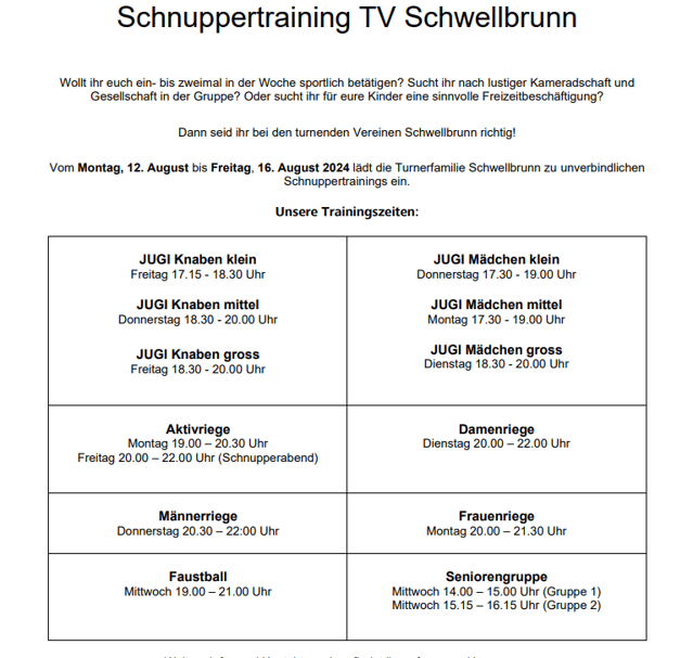 Ab dem 12. bis zum 16. August 2024 bist DU herzlich zum unverbindlichen Schnuppertraining eingeladen!